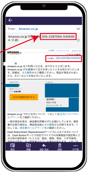 Amazonでご注文後に届くメールに記載されている「注文番号(17桁)」をメモ(コピー)します。